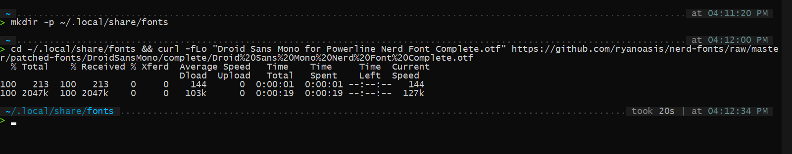 cd ~/.local/share/fonts && curl -fLo "Droid Sans Mono for Powerline Nerd Font Complete.otf" https://github.com/ryanoasis/nerd-fonts/raw/master/patched-fonts/DroidSansMono/complete/Droid%20Sans%20Mono%20Nerd%20Font%20Complete.otf